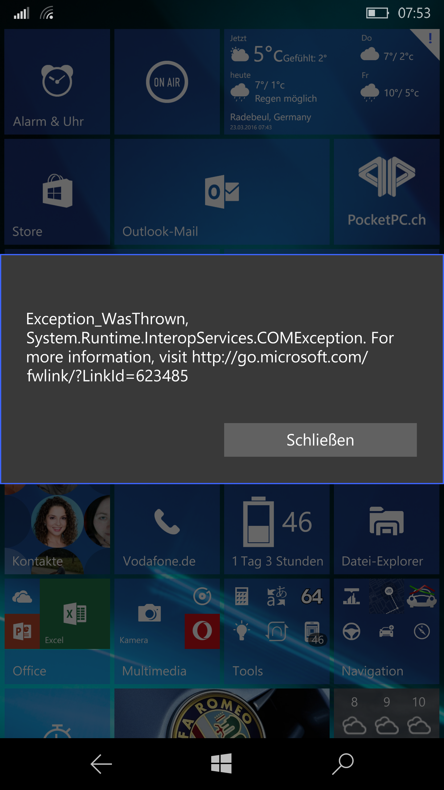 Ich habs jetzt auf meinem alten Lumia 930 reproduzieren können. Der Fehler tritt gleichwohl in einer externen Komponente auf (COMException = der Rückgabewert einer externen Komponente ist falsch). Noch seh ich nicht, wo genau der Fehler auftritt. Bin am evaluieren.