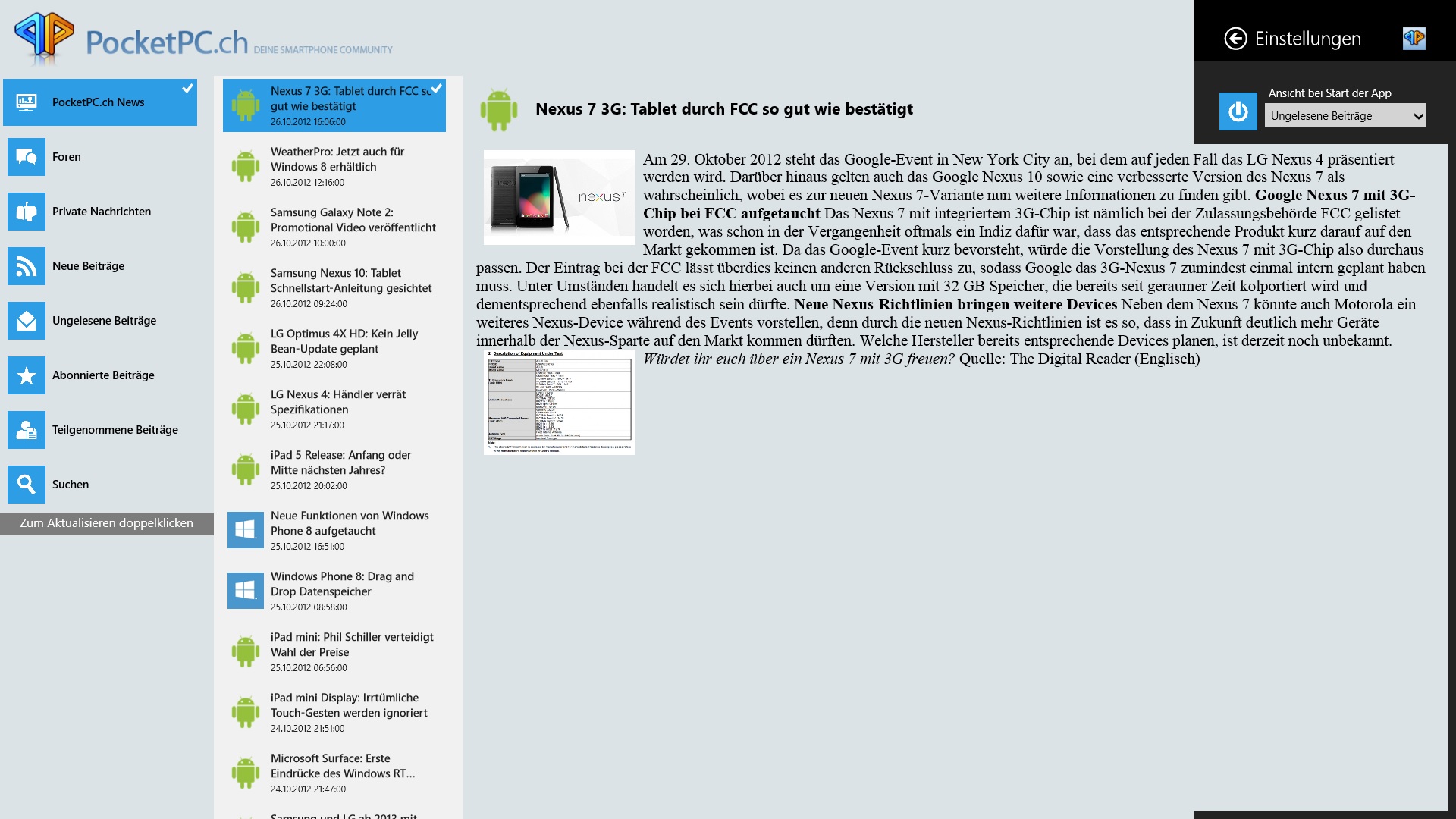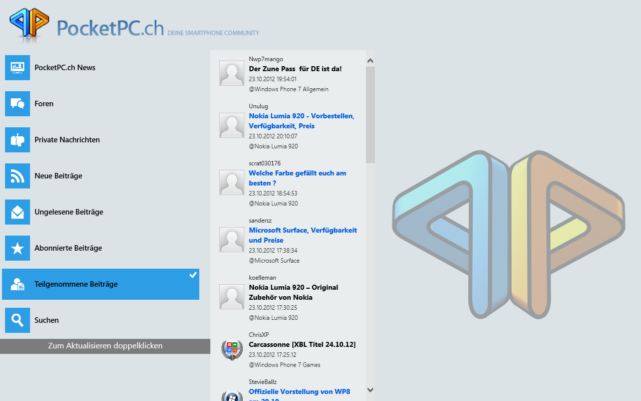 1. Mit dem Windows 8-Start für die breite Öffentlichkeit in ein paar wenigen Tagen wird auch PocketPC.ch mit einer eigenen App vertreten sein - noch besser, die App ist ab sofort kostenlos im Windows Store erhältlich. Als Neuentwicklung aus der Windows Phone 7 App heraus bietet sie zwar noch nicht alle, aber doch schon einige nützliche Features.
