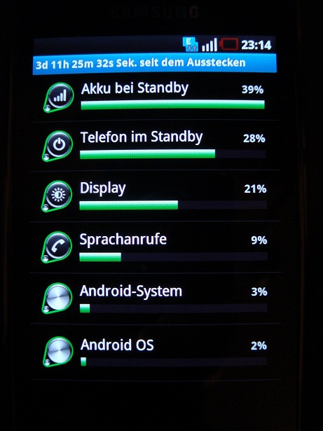 Nicht nur das Nutzungsverhalten, sondern auch die verwendete Firmware hat grossen Einfluss auf die Akkulaufzeit. Mit der JPC-FW wird man kaum auf 3 Tage kommen, ausser man benutzt sein Galaxy in dieser Zeit nie...