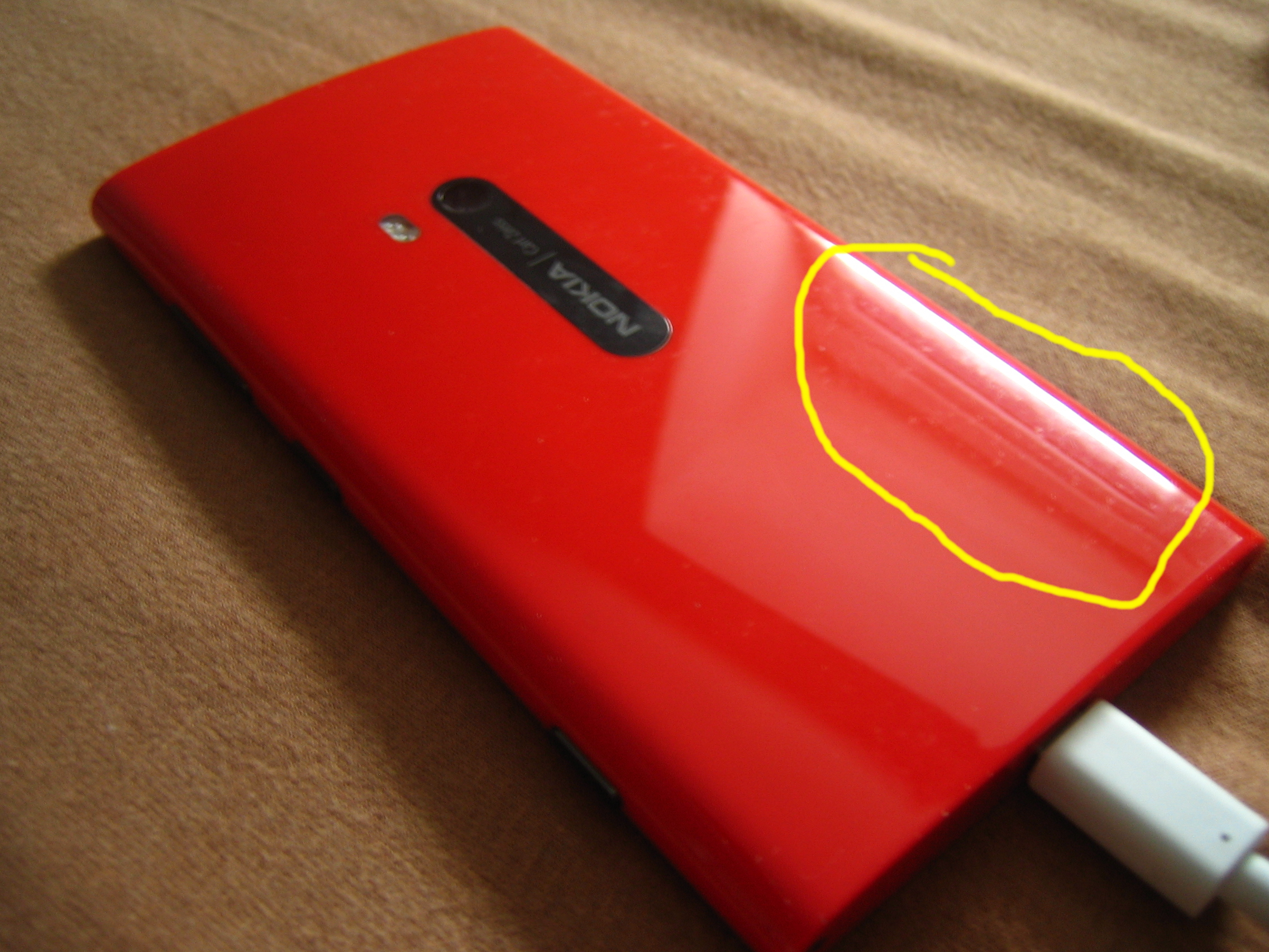 Drehen wir die Geräte mal um, sieht man beim Lumia (hier in Rot) das sich schon leichte Gebrauchsspuren am Cover gebildet haben, besonders im Licht sieht man diese deutlich, auch beim Titan sieht man Gebrauchsspuren, hier aber braucht man das Gerät nicht ins Licht zu halten, schaut euch einfach das Foto an.