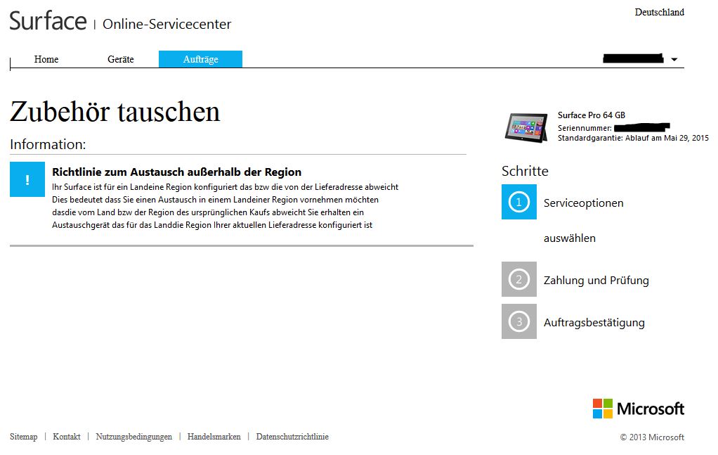 Nun würde ich sehr gerne mein Netzteil bei MS umtauschen. Es wurde gesagt, dass dies ganz einfach über folgende Seite möglich ist.