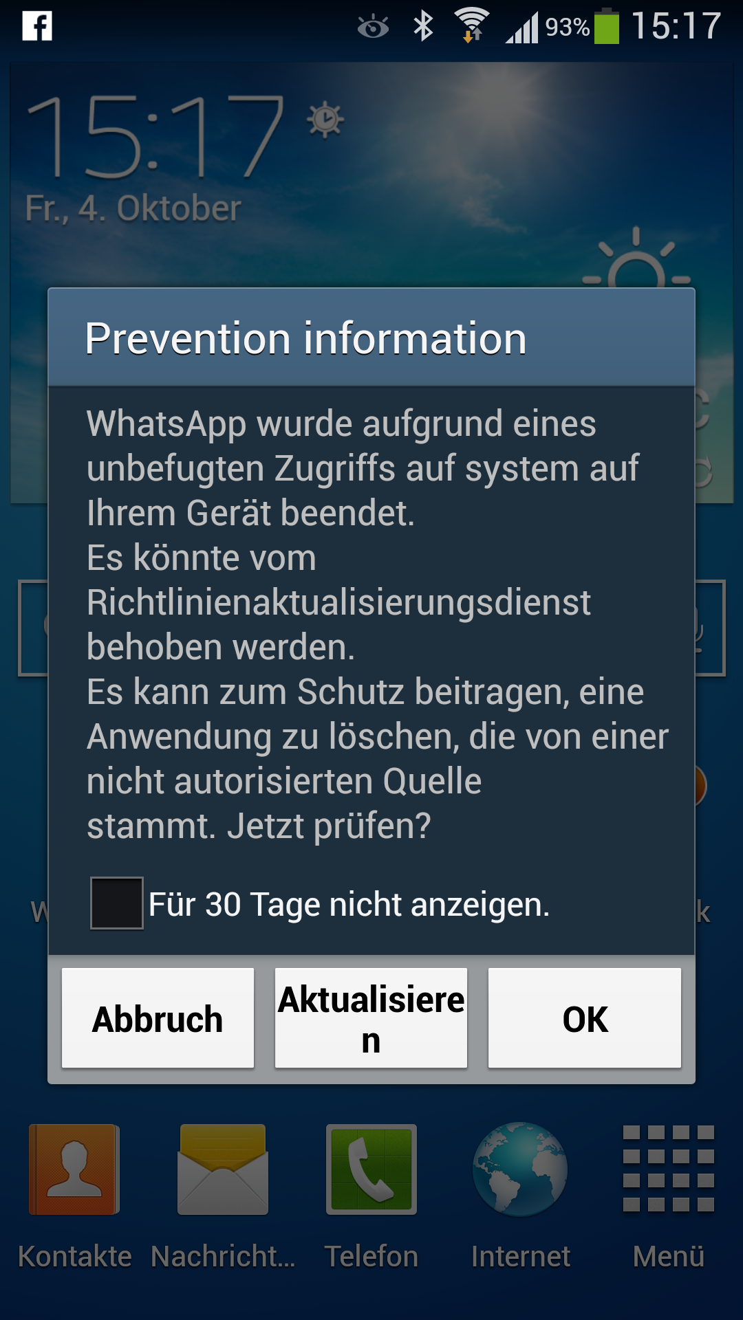 Meldung: Whatsapp wurde aufgrund eines unbefugten Zugriffs auf System beendet...