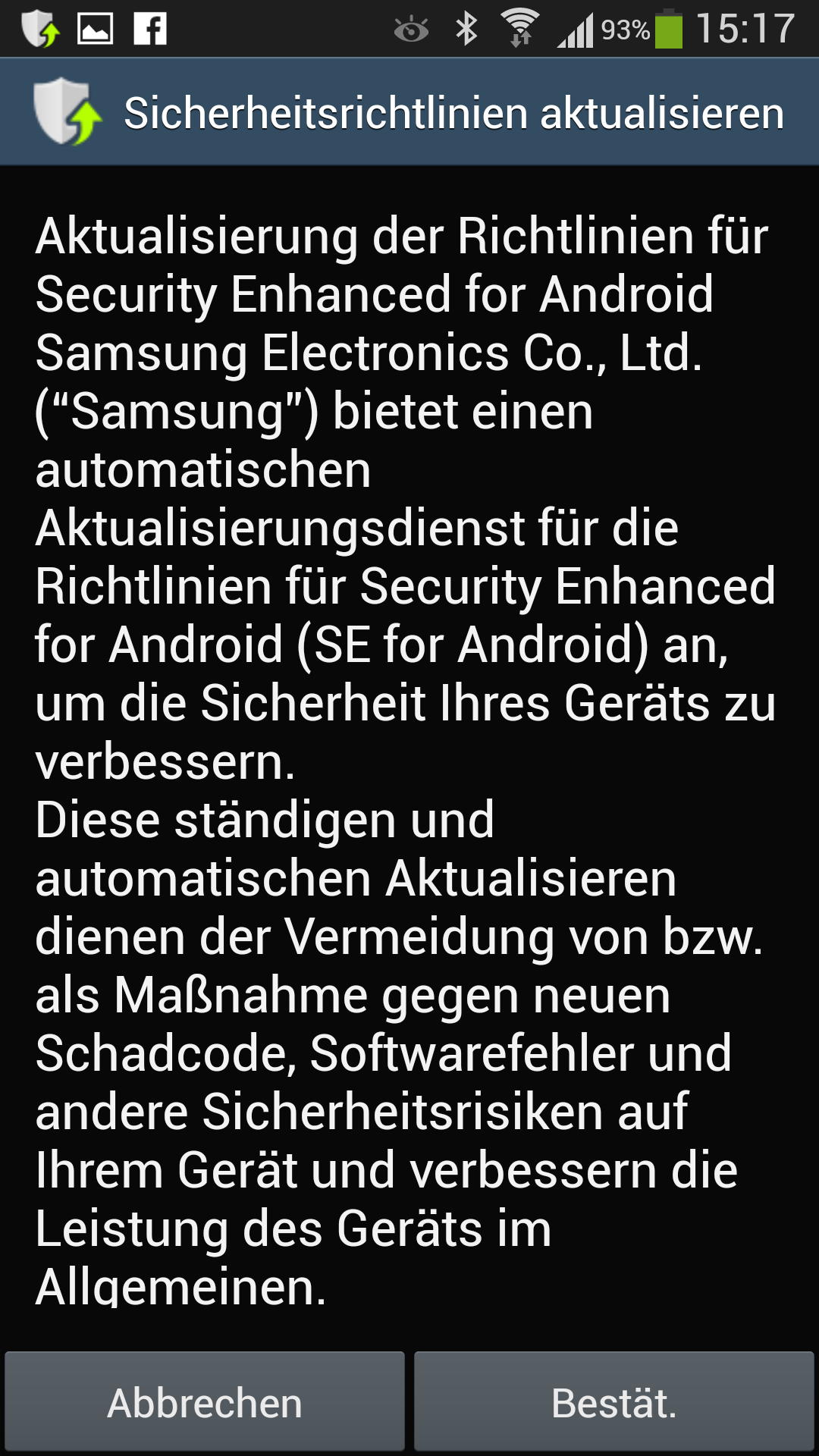 Gesternkam ein Update von Whatsapp. Und danach poppte von Samsung Sicherheitsdienst eine Meldung in Form eines Schutzschildes auf und sagte das Whatsapp die Sicherheistrichtlinien verletzt und ich die Sicherheitsrichtlinien updaten soll.