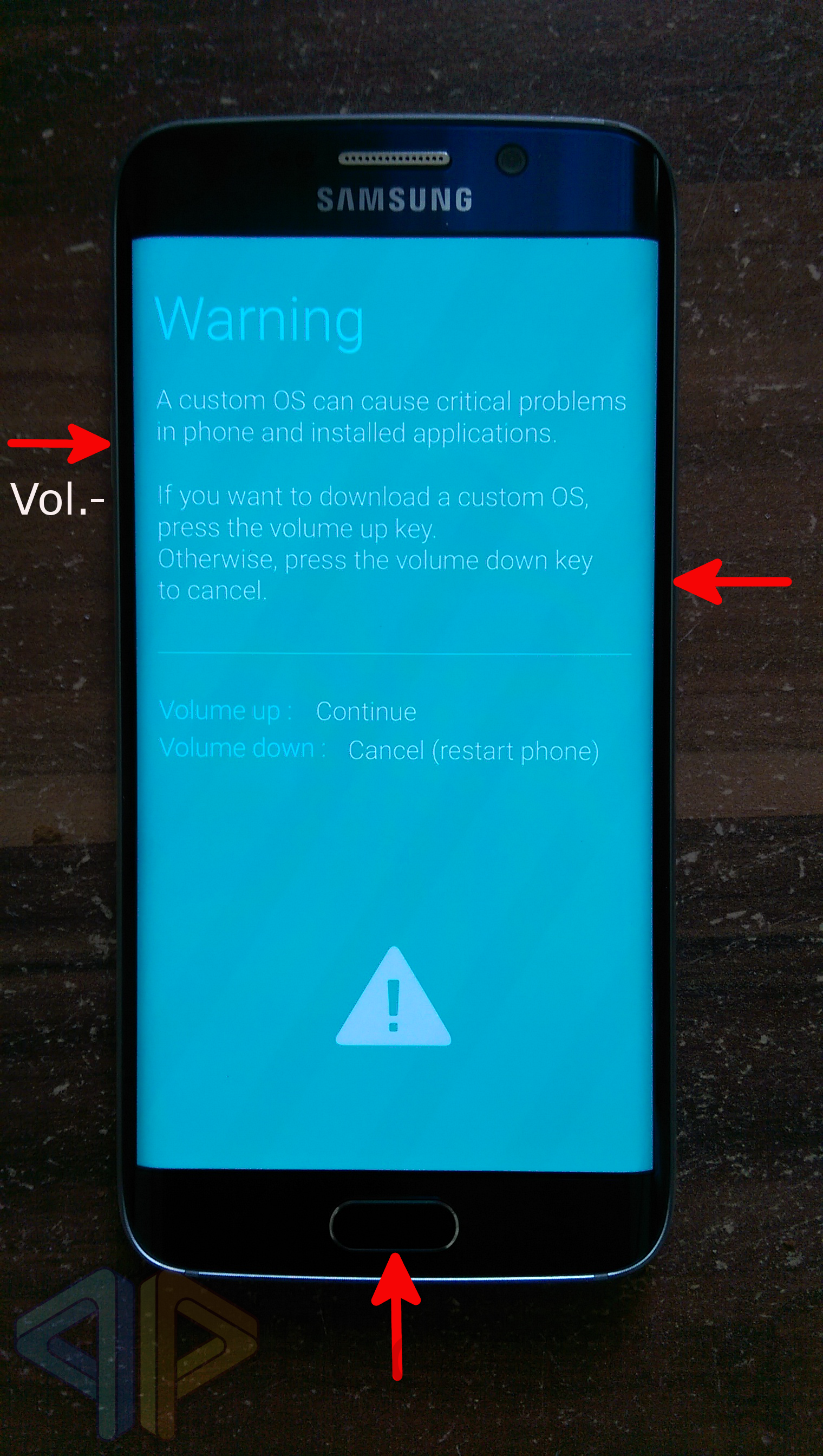 - Wenn die OEM Entsperrung aktiviert ist bringen wir das Galaxy S7/S7 Edge in den Downloadmodus. Dies geschieht, indem man im Ausgeschalteten Zustand mit Lautstärke leise (Vol. down), Home Taste in der Mitte und die Powertaste gleichzeitig gedrückt hält. Bei der Sicherheitsabfrage, die Ihr im ersten Bild seht, mit Lautstärke hoch bestätigen.