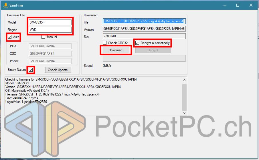 - Die jeweilige Firmware mit dem >SamFirm Download Tool< runterladen. Um eine 4-Teile Firmware über das Tool zu bekommen müsst Ihr folgendes anhaken (siehe Bild). Wenn der Download und Decryption abgeschlossen ist, müsst Ihr die .zip entpacken und Ihr bekommt die vier Dateien.