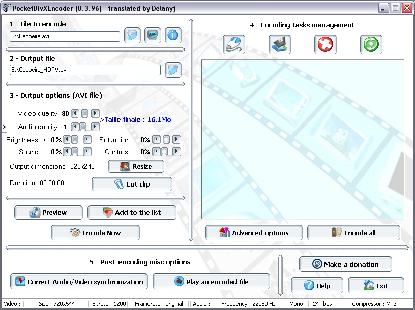 Mit dem Pocket DivX Encoder kann man ganz einfach und schnell Filme für den Genuss auf dem Pocket PC optimieren. Für ein 700MB .avi File benötigt der Pocket DivX Encoder je nach Computer ca. 20 Minuten - Die Dateigrösse ist nachher ca. 200MB und läuft auf dem Pocket PC total flüssig und ohne sichtbare Qualitätseinbusse.