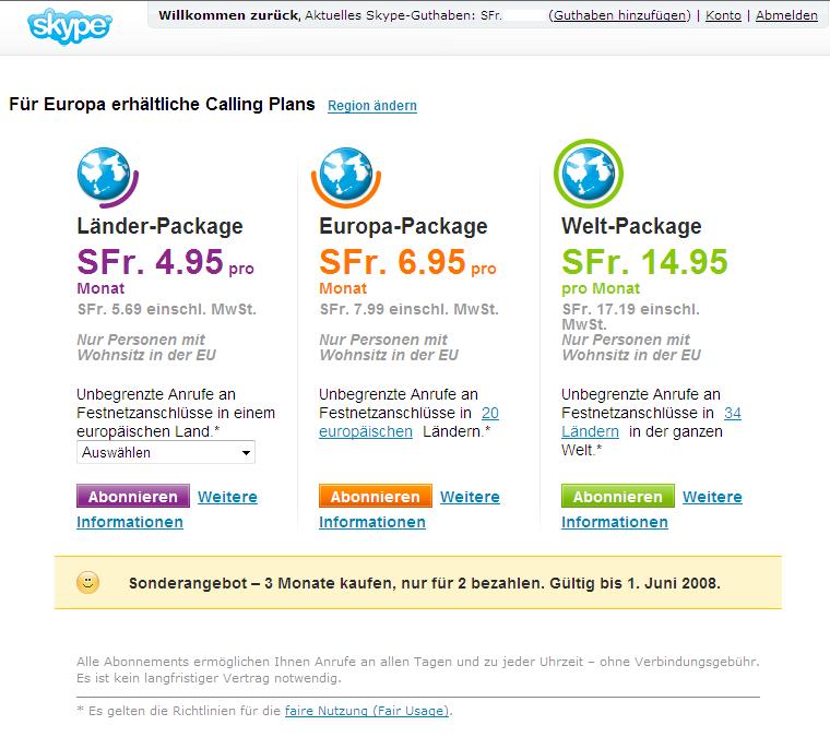 Neu kann bei Skype eine pauschaler Preisplan abonnieret werden mit dem man entweder nur in ein bestimmtes Land, oder in Europa resp. in die ganze Welt gratis auf Festnetznummern anrufen kann.