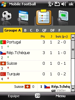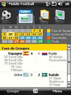 Mobile Football erlaubt einem bei der EM 2008 up to date zu sein. Das Programm ist in Deutsch, Englisch, Französisch, Spanisch, Italienisch und Portugiesisch erhältlich und bietet folgende Features:- Update (schon nach einer Minute war das letzte Tor Portugal-Tschechien eingetragen)