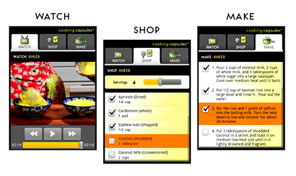 Cooking Capsule ist ein "Küchengehilfe". Bei jedem Rezept gibt es drei Optionen: Watch, Shop und Make.