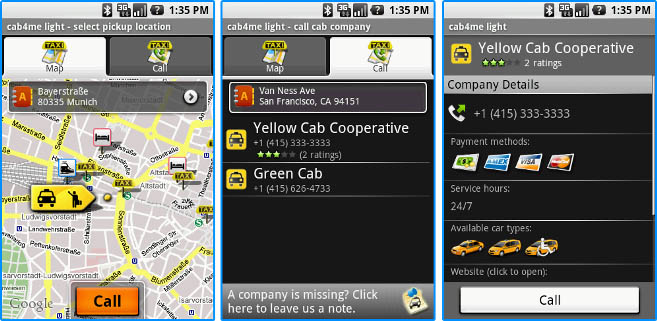 Cab4Me basiert auf Google Maps. Auf der Karte kann der ungefähre Abholort gewählt werden. Wird dann auf "Call" gedrückt, kommt eine Liste mit den lokalen Taxiunternehmen. Wird ein Unternehmen gefunden, zeigt Cab4Me auch gleich weitere Informationen wie verfügbare Fahrzeugtypen oder Bezahlmöglichkeiten an. Wird in der Datenbank von Cab4Me kein Taxiunternehmen gefunden, so wird eine Web-Suche ausgeführt - so findet sich praktisch immer ein Taxi.