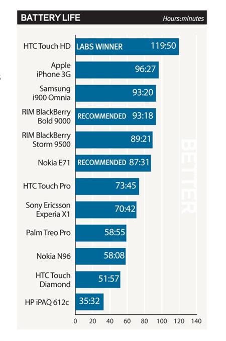 Ich nutze mein Gerät zur Zeit kaum, ferienbedingt, und mein Touch Pro macht nach 2 Tagen schlapp, der Vorgänger XPERIA hielt im aktiveren Gebrauch gleichlang wenn nicht länger. Hier im Test sind die zwei - wenn auch nur unwesentlich von den Werten her - umgekehrt positioniert. Mal sehn wie sich der Touch Pro schlägt, wenn die Ferien vorbei sind, ich tippe jetzt mal auf 12h ;)