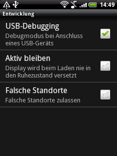 - USB Debugging im Wildfire aktivieren (Einstellungen > Anwendungen > Entwicklung)