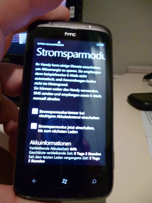 Ich habe rund 20 Minuten telefoniert, insgesamt 30 Minuten im Marketplace verbracht, 2 Anwendungen heruntergeladen und installert, 20 Minuten gesurft und die meisten vorinstallierten Anwendungen einmal gestartet und ausprobiert.