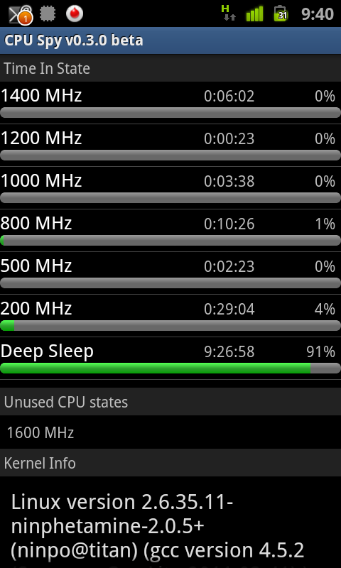 Zum Thema Overclocking bzw. Undervolting wo und wann - SetCPU hat eine Seite, auf der Statistiken gezeigt werden, welche CPU-Stufe wie lange genutzt wird. Du wirst sehen, das, ausser Du hast Games am G2 laufen, die CPU-Frequenzen 500 und 200MHz diejenigen sind, die am meisten gebraucht werden - also ist dort das Einsparungspotential beim Undervolting am größten!