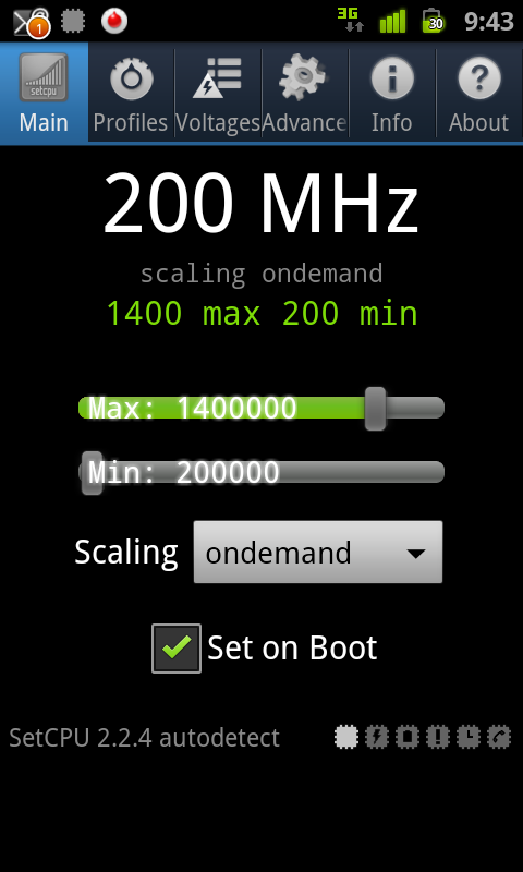 dann in set cpu auf on demand gehen somit hat das handy zur not immer genug spannung um die leistung von zb 1400 mhz zu leisten und im standby den akku zu schonen (bzw in apps die nicht wirklich leistung brauchen wie zb widgets oder radio hören)