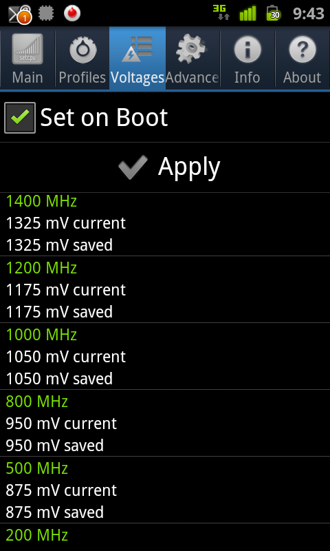 Full voltage control interface. Via SetCPU you can set voltage as low as 800mV or as high as 1500mV for each speed in the database. If you're possessed with the intelligence of a baboon and destroy your phone as a result, do not come crying to us. All you'll get is a quote in this thread with much mocking from myself and your peers.