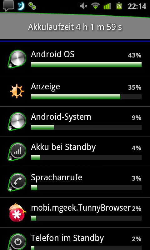also in 4h 20% weg... wenig gemacht, nur trillian, google sync, noled, palmery weather, beautiful widgets weather, gmailwidget+, gmail label notifier und easyprofiles lief.