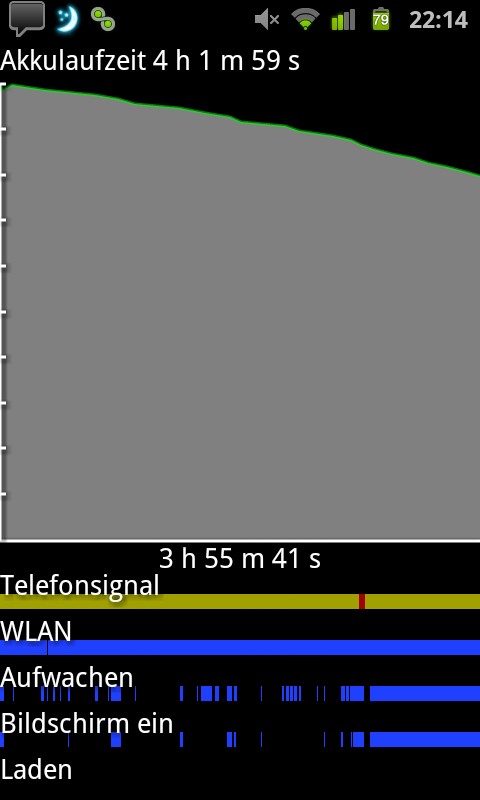 Wenn ich sehe, dass Dein Phone in den 4 Stunden weit über die Hälfte der Zeit Wach war und das Display fast die Hälfte der Zeit an war, dazu noch WLAN und Deine Batteriefresserapps (trillian, google sync, noled, palmery weather, beautiful widgets weather, gmailwidget+, gmail label notifier und easyprofiles ), ...