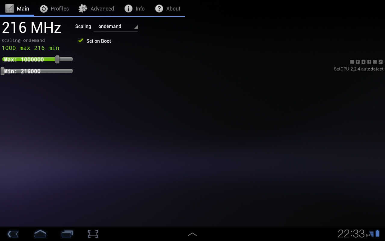 Und was das übertakten betrifft habe ich soeben "CPU-Tuner" durch Zufall im Market entdeckt. Mit dieser App kann ich problemlos den Regler auf 1,4 Ghz ziehen. Und siehe da, nach einem Neustart kann ich nun auch bei SetCPU den Haken bei Set on Boot auf dem Main-Reiter setzen. Verstehe wer will....