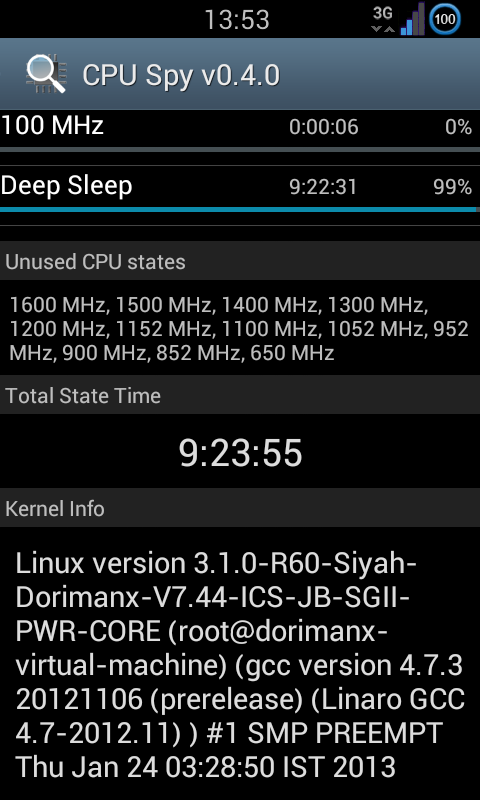 Was sich aber bei mir jetzt einmal ergeben hat, ist, als ich das CRT-Off nutzte, hatte sich mein Handy einfach selbstständig ausgeschaltet??? Was das nun wieder sein soll, ich weiß es nicht! Hat das jemand von euch auch schon gehabt oder festgestellt? Was ich aber sagen kann, ist die Tatsache, das der Akkuverbrauch in Verbindung mit dem NeatROM Lite v4.2 und dem DorimanX-Kernel sehr gut harmoniert und ich in der Zeit von 04:30h bis um 13:54h, ohne dabei das Handy zu nutzen, keinen einzigsten % an Akkuverbrauch hatte, seht dazu den Screenshot mit der Zeitangabe von SetCPU (9:23:55) und vergleicht dazu mal die DeepSleep Zeit (9:22:31):