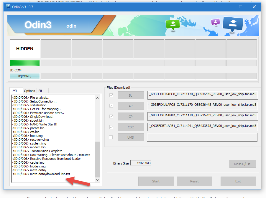 1. Mit BL, AP, CP und "HOME_CSC_DBT_G935F..." --> nach der hidden.img ist der Flashvorgang abgebrochen und das S7 hing im Bootloop. Erklären kann ich mir das nur so wie bereits in der Anleitung beschrieben, je nach CSC blockiert der Flashvorgang bei der hidden.img, welche in der "HOME_CSC" und "CSC" steckt. Das liegt womöglich an unterschiedlichen Partitionen.