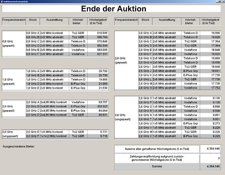 Zu den, die das Auktionsprinzip nicht verstehen: Die Frequenzbänder die unter den Hammer kommen sind ein knappes Gut. Knappe Güter haben für gewöhnlich die Eigenschaft, dass sie wertvoll sind. Z.B. weil sie einen Nutzen stiften oder eben zum Geldverdienen gebraucht werden können. Wie soll nun der Staat die Frequenzen an die 4 interessierten Unternehmen verteilen? Per Los, nach Sympahie? Daher gibt ist die Versteigerung kein schlechter Weg. Er bringt ein paar Steuergroschen und die Bieter können sehr wohl berechnen, bis zu welchem Betrag sich das Bieten lohnt. Schließlich wollen diese damit in den nächsten Jahren ordentlich verdienen.