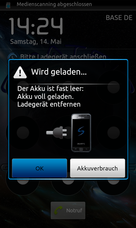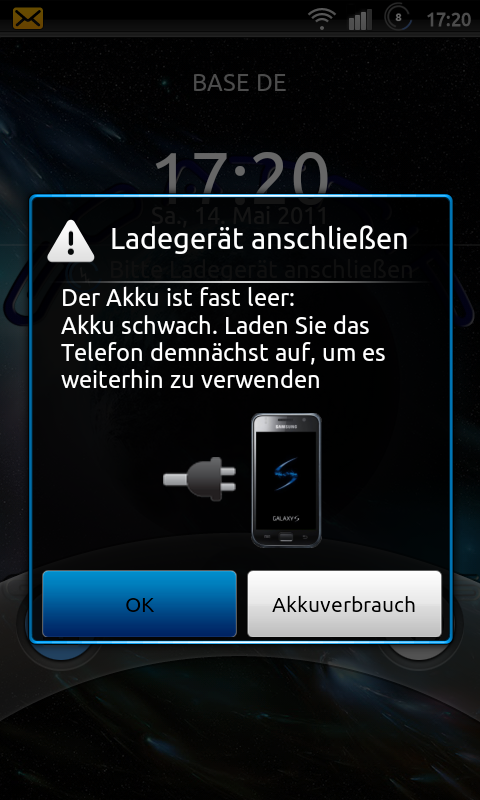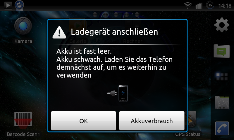 Akku schwach. Laden Sie das Telefon demnächst auf, um es weiterhin zu verwenden