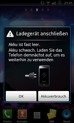 Gibt es auch nur bei weniger als 20% und im Android-Lockscreen oder im Popup "Ladegerät anschließen".