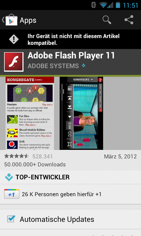 Und gibt es eine Möglichkeit, Flash zum Laufen zu bringen? Ich hab diesen Thread hier nach Flash durchsucht, aber da es hier ja ums flashen geht, ist das in dem Zusammenhang ziemlich aussichtslos. Konkret kann ich Flash aus dem Market nicht installieren. Mit meinem Gerät nicht kompatibel. Dann hab ichs mit Titanium Backup aus einem früheren Backup wiederhergestellt. Scheint aber nicht zu funktionieren.