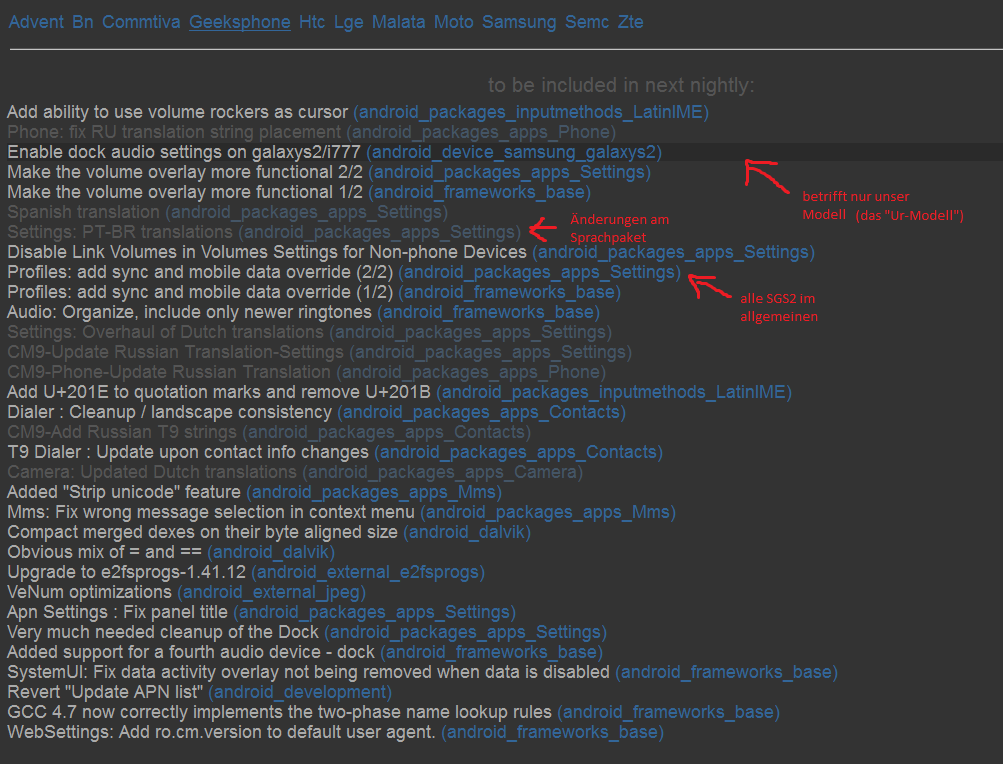 Was dort zu sehen ist, sind die Changes nur für das Galaxy S2. Dann muss man aber noch unterscheiden. Denn grundsätlich betreffen alle Änderungen unsere SGS2s, AUßER es wird auf etwas anderes hingewiesen. Eben zum Beispiel die qualcomm Variante, gern mit "qcom" oder ähnlich abgekürzt. Dann gibt es aber auch Vermerke, die sich NUR auf unsere Geräte beziehen. Diese werden dadurch dargestellt, dass der jeweilige changelog mit einem "dunklen Balken" hinterlegt wird (diese sind auch in der Regel von codeworkx erstellt). Würde ja einen screenshot machen, aber leider ist die API zurzeit down und die Site nicht erreichbar.