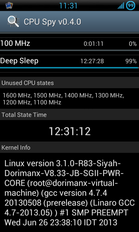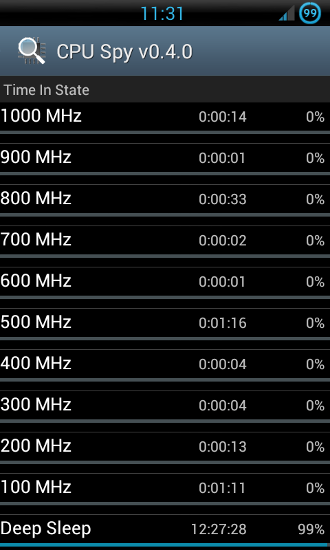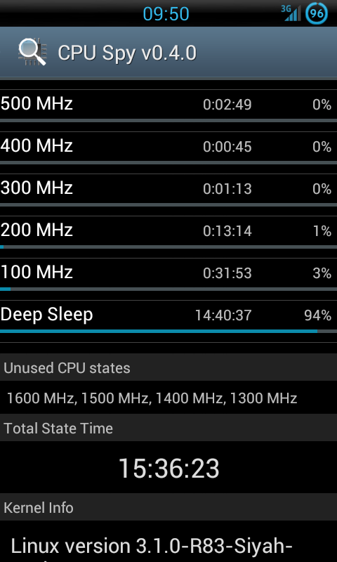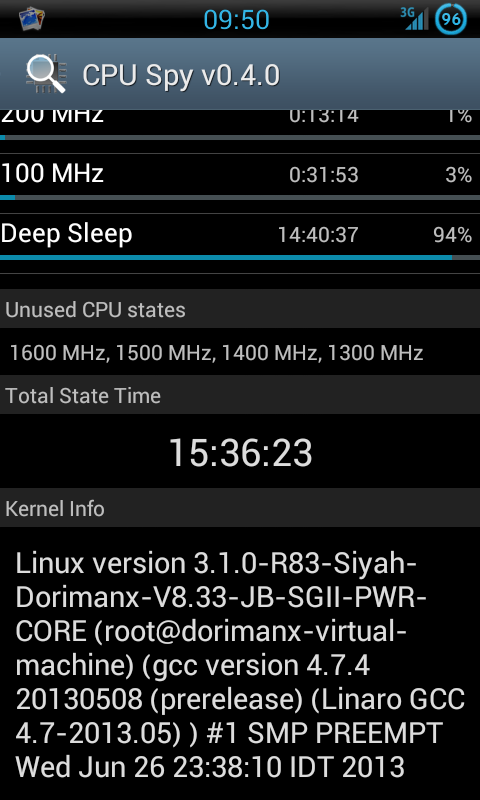 Soweit ich jetzt richtig liege, wird ja bei der Installation des DorimanX Kernels der Hyper Governor als Standard Governor genommen, nicht der Nightmare ;-). Ich weiß jetzt nicht, wie der Hyper Governor so auf dem System arbeitet, da ich ihn noch nicht genutzt habe, sondern, seit Einführung des Nightmare Governors, den Nightmare Governor nutze. Ich habe heute nochmal einen Nichtnutzngszeittest durchgeführt, wo ich sehen wollte, wie sich im DeepSleep, durch erzeugte Wakelogs, die entsprechenden Taktungen wiederspiegeln. Diesmal habe ich tatsächlich das Handy weitesgehend ruhen lassen, außer für heute morgen eine Weckphase genutzt und alle 3 Stunden eine Wetteraktualisierung durchführen lassen. Entsprechendes Ergebnis kannst du nun in den Screenshots ersehen: