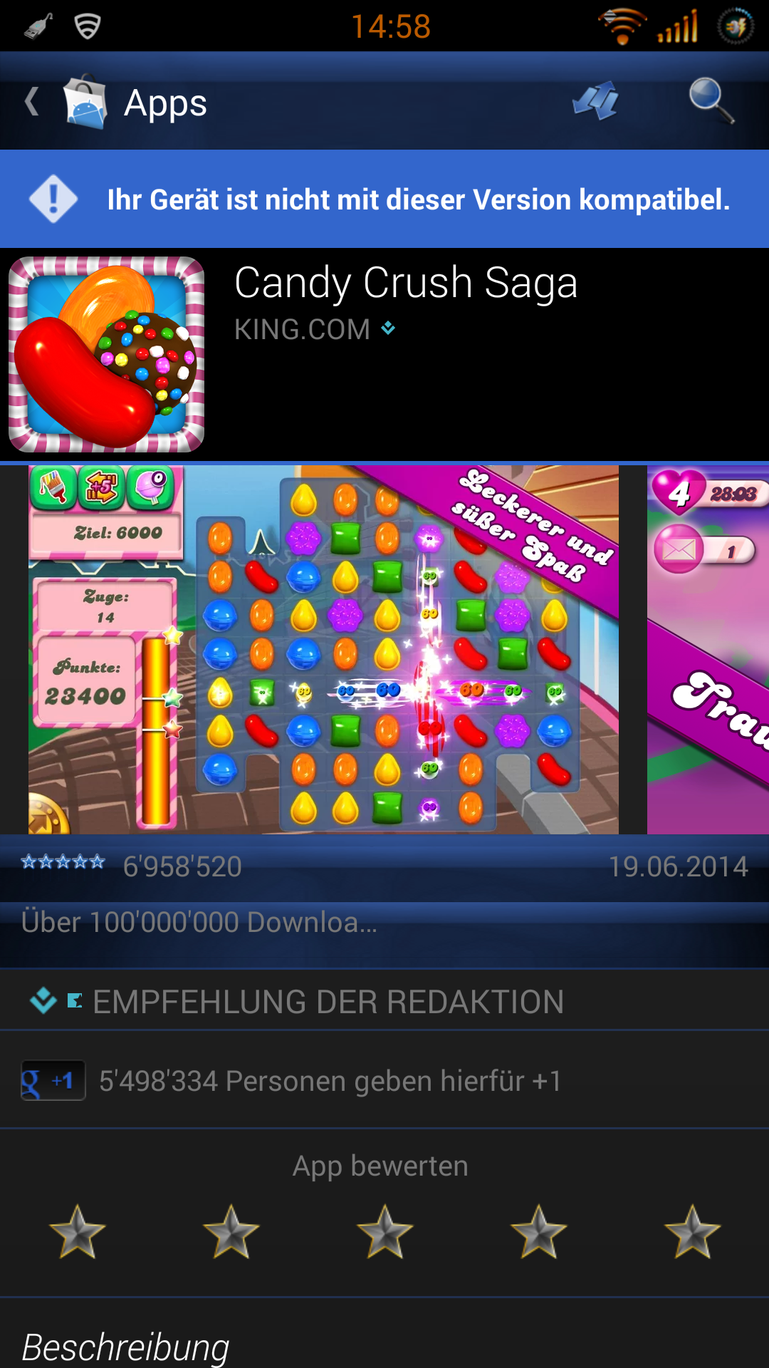 so als Info ... Candy Crush ist nicht mit dieser Version Kompatibel