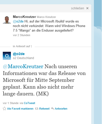 Frage: Hi, auf der Microsoft //build/ wurde es noch nicht verkündet: Wann wird Windows Phone 7.5 "Mango" an die Enduser ausgeliefert?