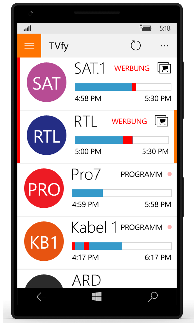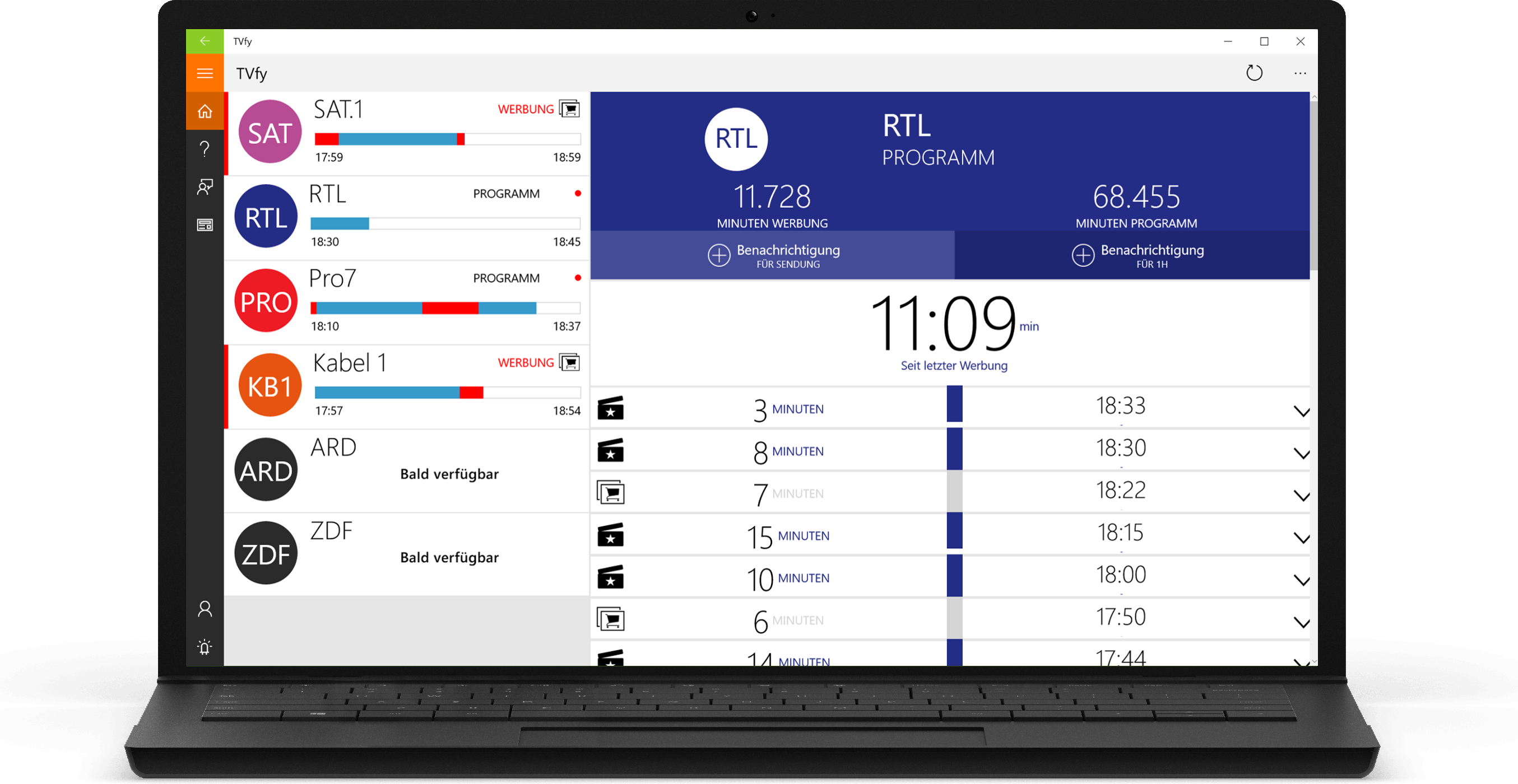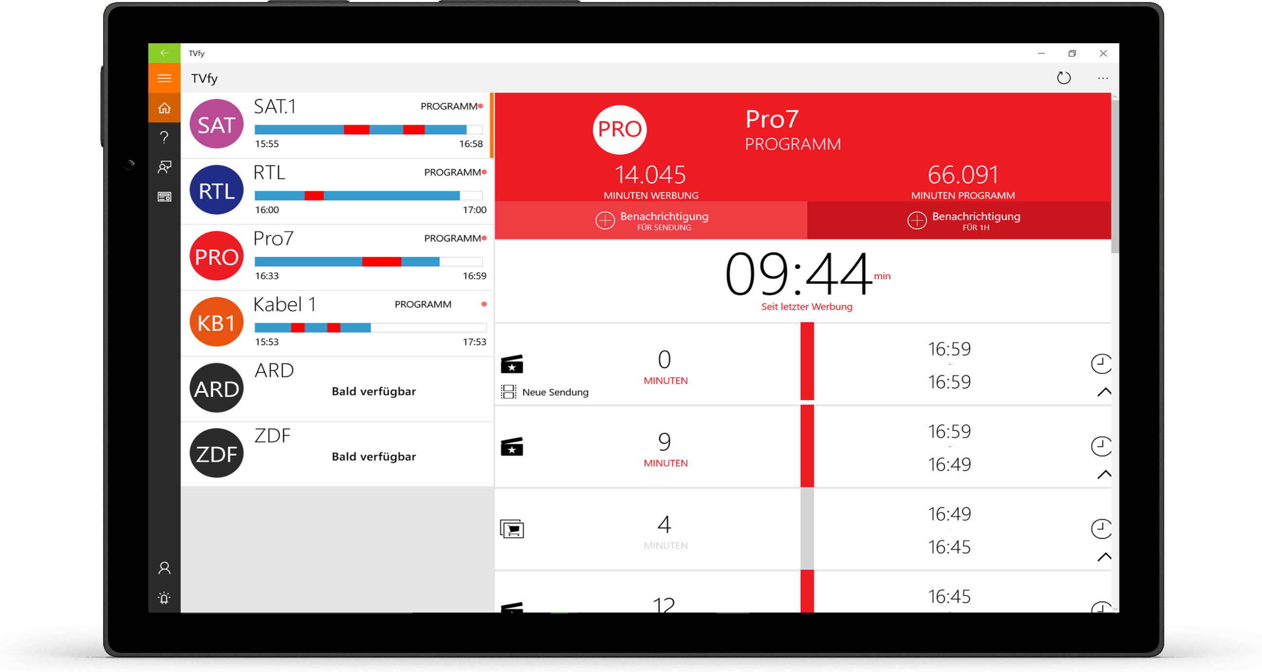 Ihr wählt den Sender in der App aus und TVfy verschickt automatisch am Ende der Werbung eine Notification an euch. So könnt ihr währenddessen ganz entspannt anderen Dingen nachgehen.Zusammen mit einem Freund habe ich innerhalb von 6 Monaten ein Programm entwickelt, dass das TV-Signal analysiert und selbstständig mit Hilfe von intelligenten Algorithmen entscheidet, ob auf einem Sender Werbung läuft oder nicht. Diese Information wird dann an einen Server weitergeleitet, der euch in letzter Instanz über den aktuellen Stand informiert. Das ist alles recht kompliziert und verlangt einiges an Hardware, weswegen es aktuell die wichtigsten vier Sender zur Auswahl gibt: